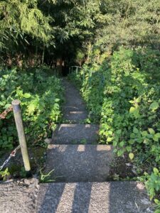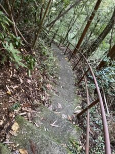 こちらは確かに鳥居から参道が下り坂になっています。階段がありますが、狭く、かなり急です。