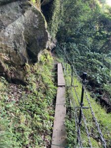 道は曲がりくねっており、柵のはるか下から川のせせらぎが聞こえます。