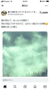 「雲が流れて幻想的」とのことでしたが、たまなぎは何となく「霧に覆われた深い山」をイメージしてしまいました。とても幻想的な風景でしたので「物語が始まりそうです」と返信いたしましたら、有難くも「読ませて下さい」とのお返事を頂きました。森くま堂さま、ありがとうございました。(森くま堂さまは絵本テキスト大賞を受賞されてデビューされた絵本作家さんで、『ちこくのりゆう』『おむすびころりんはっけよい』など、ユーモアあふれる中にも思わずはっとさせられる、素敵な作品を沢山発表されています。)