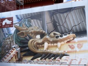 正殿の屋根の上に置かれる予定だという龍頭。