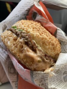 飛行機は夕方だったので、夕食を買ってから飛行機に乗ることに。スパムおにぎりを買いたかったのですが、こちらのお店は何と40分待ちと聞き、ハンバーガーに変更。